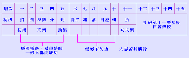 要知道初架、形架的練習是為了由外引內(即外形動作引導內氣運行),而勁架已到了由內催外的階段 (內氣催動外形)。因此體內內氣流通,丹田充實,處處想發力。這些都是不難學會的,主要掌握正確的練功方法,層層遞進,一般人都能成功。然而想突破到第十一層,便需要下苦功了。第六層至第十層主要練習更上乘的功法,每一層自有其妙處。如能堅持下去,自能功力大進,猶如脫胎換骨,令人欲罷不能。