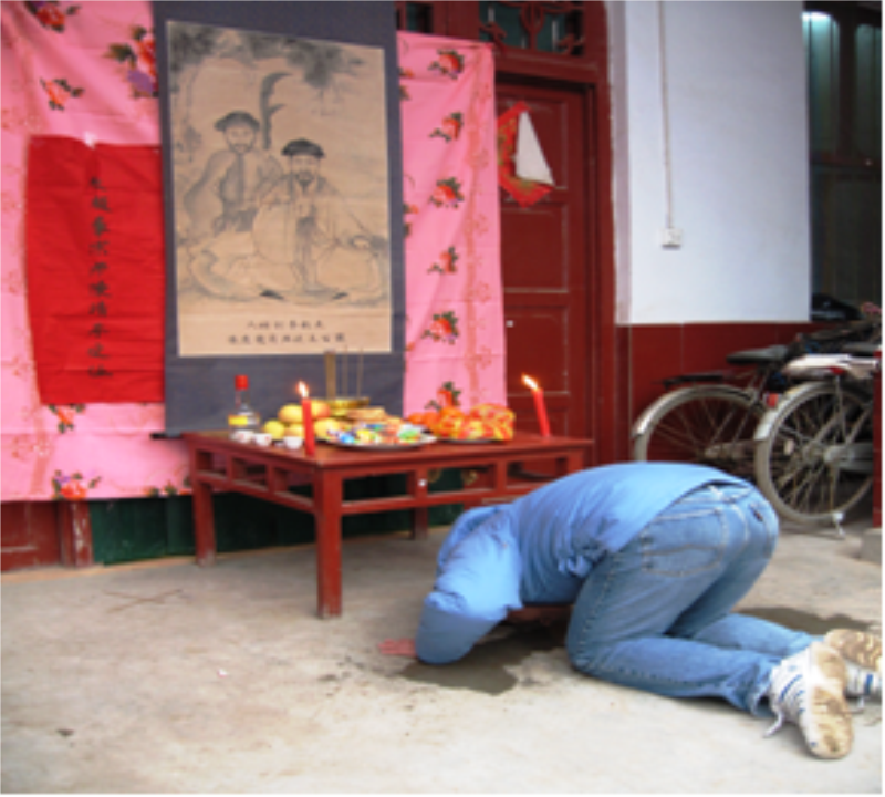 鞭炮之後師父向師公和師母磕三個頭,交了拜