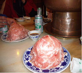離席後,我們回房睡了超過二小時,可見今趟三八席是多麼挑戰胃部。第二個早晨,我們正式嘗到家常便飯,早飯跟晚飯菜色一樣由一碗粥、四個小菜 和任君取的饅頭組成。四個小菜中經常有冷盆,經常吃不消。師父和揮平日吃兩個饅頭,我乃平凡人,安能吃兩個?朗仔吃的最慢。中午有時有螺絲麵,好吃得很。就在參觀黃河大橋的那中午,我們在當地一家火鍋店打邊爐,師父從前習拳時亦喜於那兒午餐因口味較接近香港、價錢不貴 ( 相對香港物價,當地12元可吃一大堆羊肉 )。